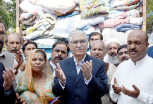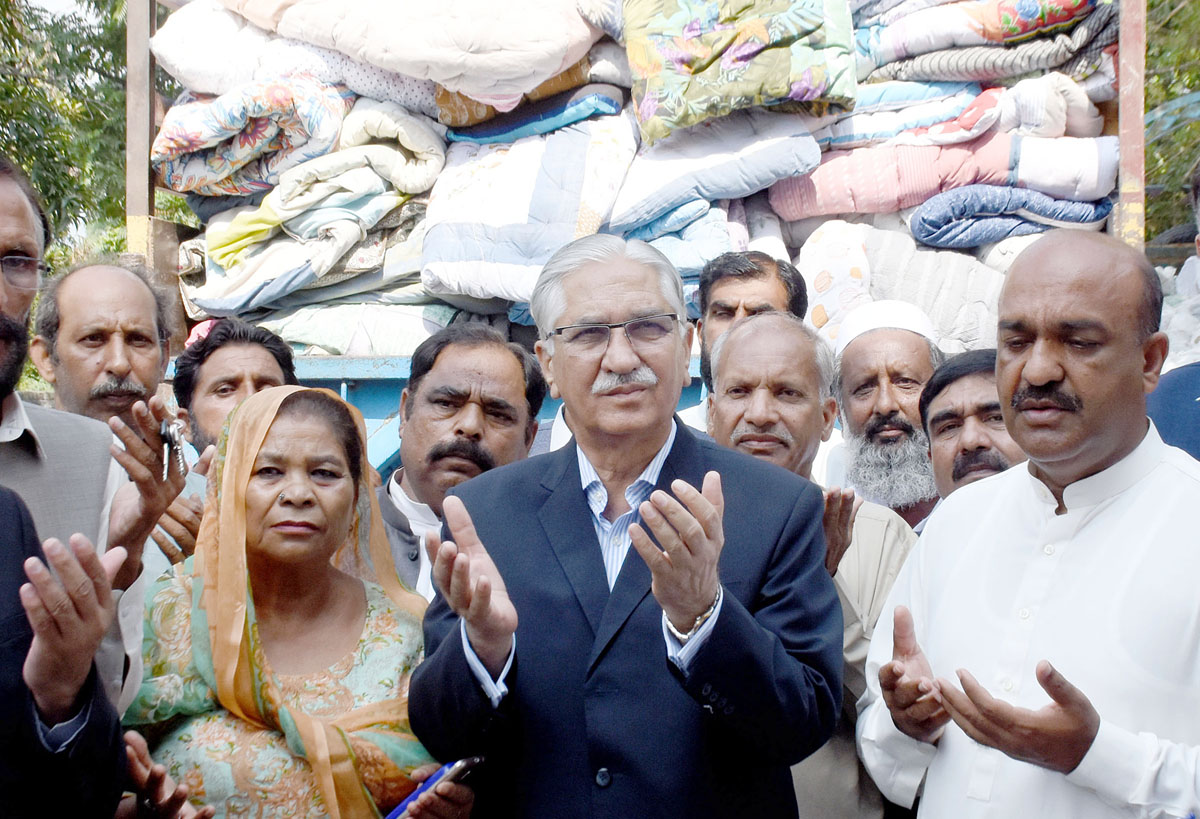 ISLAMABAD: Secretary General Pakistan People Party Syed Nayyar Hussain Bukhari and others praying before dispatched truck of reliefs goods for flood victims