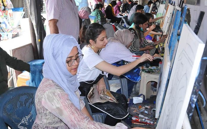 ISLAMABAD: Young girl learning and painting at Peshawar Morr Sunday Bazar.