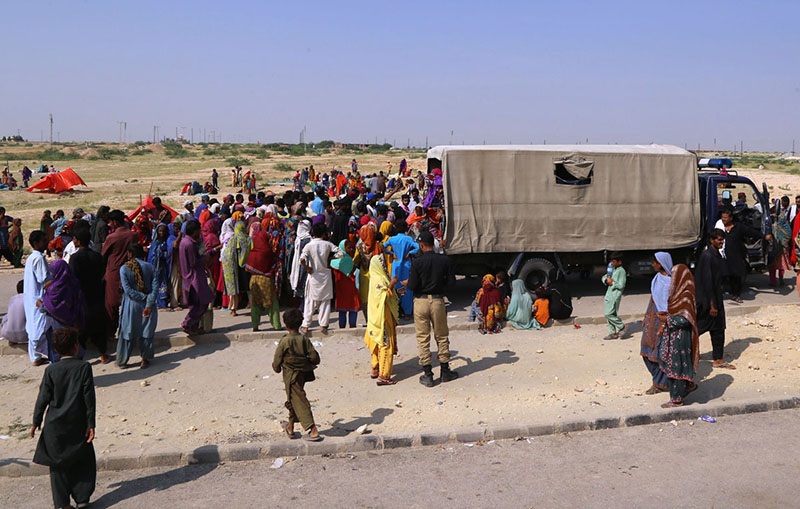 HYDERABAD: Large number of flood affected people gather arounf the relief truck for Rashan at makeshift camp in Jamshoro.