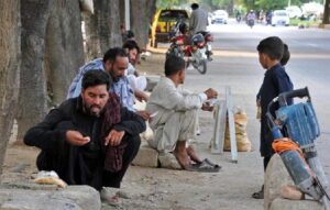 ISLAMABAD: Labourers are having their lunch along footpath near Peshawar Mor