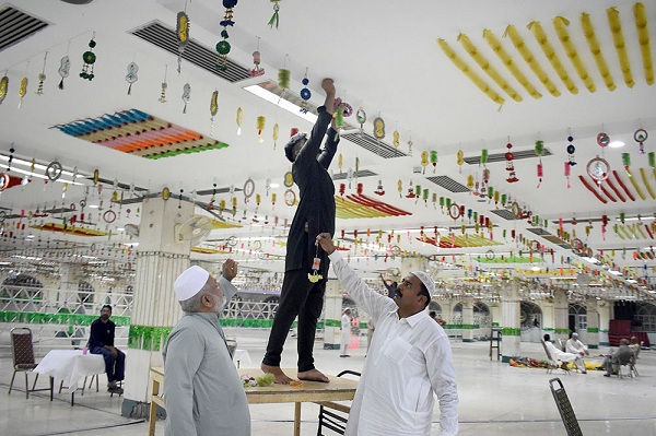 LAHORE: Devotees are busy in decorating gathering hall at Shrine of Data Gamj Baksh on the eve of 979 Annual Urs of Hazrat Ali Bin Usman Al Maroof Data Ganj Bakhsh.