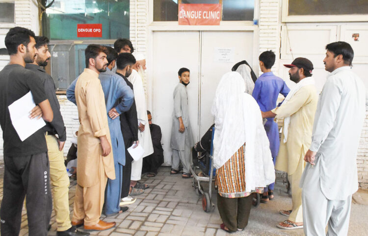 ISLAMABAD-Sep15: People stands in a queue outside dengue clinic for dengue test at Poly Clinic, in Federal Capital. Major cities of Pakistan saw a sharp surge in dengue cases as 164 patients were diagnosed with dengue in the past 24 hours in Punjab, whereas The federal capital reported 72 more dengue cases in the last 24 hours taking the total tally of cases to 943 in the current season. ONLINE PHOTO by Sultan Bashir