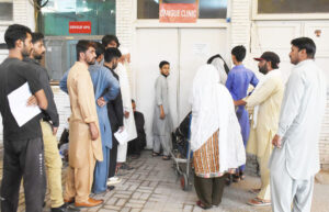 Pic15-026 ISLAMABAD-Sep15: People stands in a queue outside dengue clinic for dengue test at Poly Clinic, in Federal Capital. Major cities of Pakistan saw a sharp surge in dengue cases as 164 patients were diagnosed with dengue in the past 24 hours in Punjab, whereas The federal capital reported 72 more dengue cases in the last 24 hours taking the total tally of cases to 943 in the current season. ONLINE PHOTO by Sultan Bashir