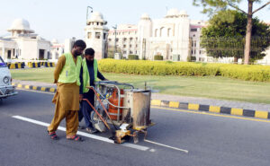 Pic19-034 ISLAMABAD-Sep19: Workers of Capital Development Authority (CDA) are marking a crossing line on a road at Constitution Avenue, in Federal Capital. ONLINE PHOTO by Sultan Bashir