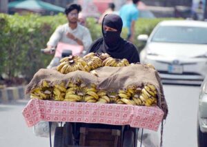 FAISALABAD: A woman vendor pushing handcart on a busy road loaded with bananas for selling in the city