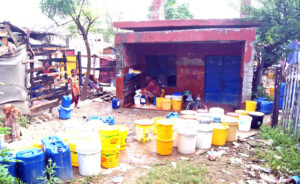 RAWALPINDI: A gypsy woman filling water in her buckets from a filtration plant alongside Dhoke Ratta Nala Lai, in the city