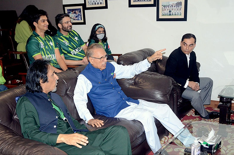 KARACHI: President of Pakistan Dr. Arif Alvi along with Chairman of the Pakistan Cricket Board (PCB) Ramiz Raja, watching the third Twenty 20 international cricket match between Pakistan and England at the National Cricket Stadium.