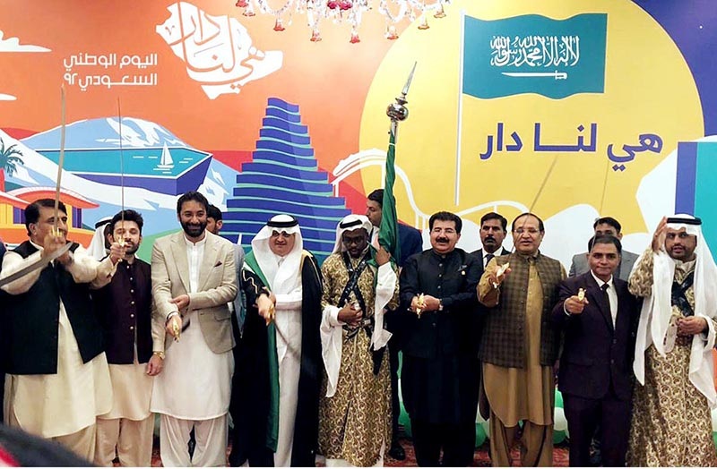 ISLAMABAD: Chairman Senate Muhammad Sadiq Sanjrani and Senators in a group photo at the ceremony organized by Saudi Embassy to mark the national day of the Kingdom of Saudi Arabia.