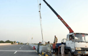 Pic26-038 ISLAMABAD-Sep26: Workers are busy in installing street light poll at 7th Avenue Bridge in Federal Capital. ONLINE PHOTO by Sultan Bashir