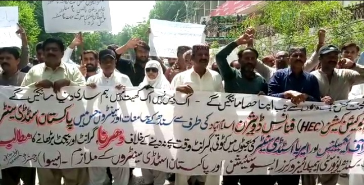 Hyderabad: The employees of Sindh University are protesting against the cut in the budget of the universities.