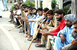 Pic28-041 ISLAMABAD-Sep28: Farmers sitting on footpath as hold tree wooden sticks during protest in favor of their demands at Jinnah Avenue road in Federal Capital. ONLINE PHOTO by Sultan Bashir