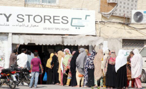 RAWAPINDI: People stands in queue outside Utility Store for purchasing subsidized grocery items at Sir Syed Chowk, in the city