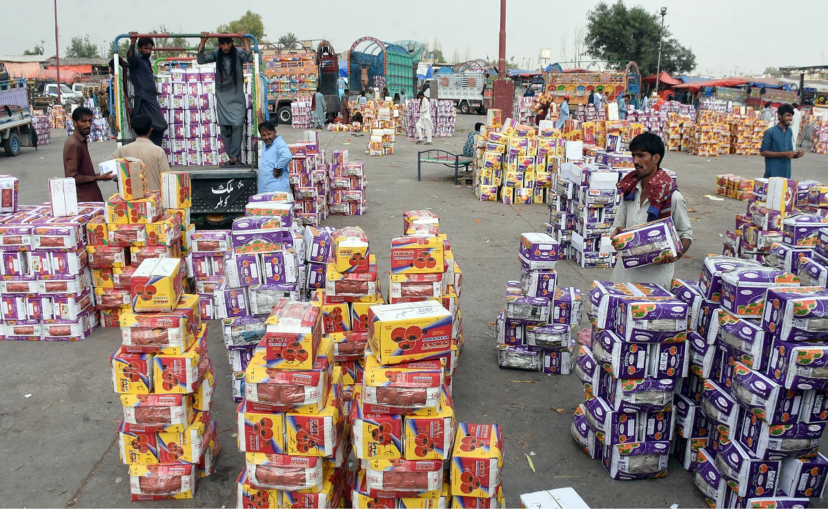 ISALAMABAD-Oct01: Labourers are busy in unloading Fruits crates from a loading vehicle at I-11 Fruit and Vegetable Market in Federal Capital.