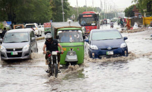 LAHORE: Vehicle passing through rain water accumulated on the road after heavy rain in Provincial Capital.