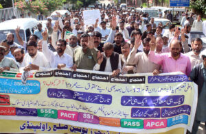 RAWALPINDI: Activists of Punjab Teachers Union shouting slogans during a protest a rally in favor of their