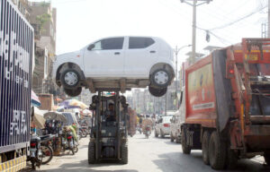 RAWALPINDI: A traffic warden carrying wrong parked vehicle on a fork lifter at Liaquat road in the city