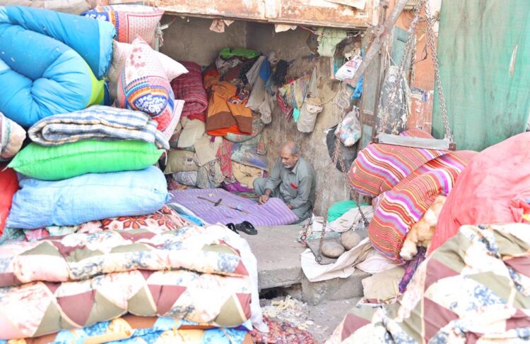 ISLAMABAD: October 06 A man is sewing and manually making woven quilt at his work place for upcoming winter as the demand for woolies and quilts increase especially in the central and northern areas of the country where the mercury drop in minus .APP