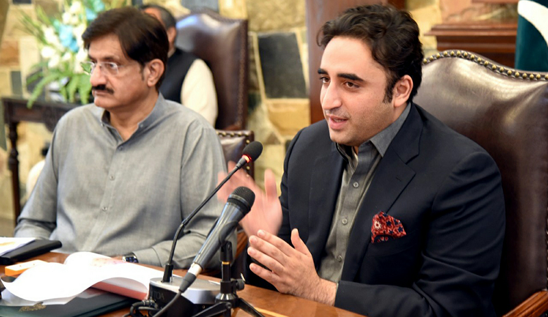 Karachi: Chairman PPP and Foreign Minister of Pakistan Bilawal Bhutto Zardari addressing press conference at CM House. He is flanked by CM Syed Murad Ali Shah.
