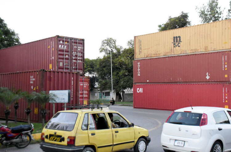 ISLAMABAD-Oct07: A view of containers place alongside Serena Chowk in Federal Capital. Government is making security arrangements in the Islamabad to deal with the expected long march of Pakistan Tehreek-e-Insaf (PTI). Containers have been installed in the entrances of the capital while security wall is being built in the red zone area to deal with the attendants of PTI long march. ONLINE PHOTO by Sultan Bashir