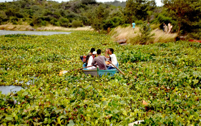 ISLAMABAD: Youngsters stuck in a green plants during boat riding at Rawal Lake