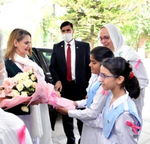 First Lady of Pakistan/Chief Girl Guide, Begum Samina Arif Alvi, being welcomed upon her arrival, at the Pakistan Girl Guides Association National Headquarters, Islamabad, on the occasion of the International day of the Girl, on 11-10-2022.
