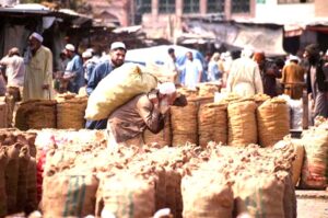 PESHAWAR: Laborer loading traditional sweet stuff Gur on a delivery truck at Gur Mandi.