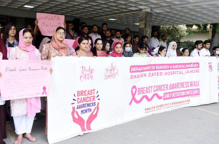 [caption id="attachment_7658" align="alignnone" width="300"]<img class="size-medium wp-image-7658" src="https://dailydateline.com/news/wp-content/uploads/2022/10/202210141709273071-300x197.jpg" alt="" width="300" height="197" /> Lahore: Doctors and nurses hold placards during Breast Cancer Awareness Walk at Shaikh Zayed Hospital on the eve of World Breast Cancer Day.[/caption]