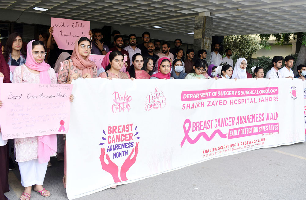 Lahore: Doctors and nurses hold placards during Breast Cancer Awareness Walk at Shaikh Zayed Hospital on the eve of World Breast Cancer Day.