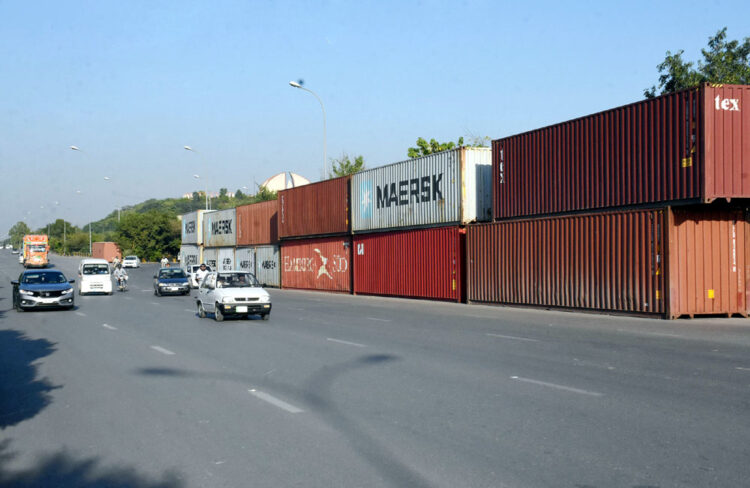 [caption id="attachment_7716" align="aligncenter" width="300"]<img class="size-medium wp-image-7716" src="https://dailydateline.com/news/wp-content/uploads/2022/10/202210151959265998-300x195.jpg" alt="" width="300" height="195" /> ISLAMABAD: A view of containers placed at Srinagar Highway due to PTI long march, in Federal Capital[/caption]