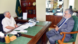 Islamabad: Newly appointed HEC Chairman Mr. Mukhtar Ahmed calls on the Federal Minister of Education and Professional Training Mr. Rana Tanveer Hussain.
