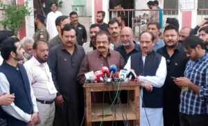 APP34-161022 FAISALABAD: October 16 – Federal Minister for Interior Rana Sana Ullah Khan talking to media persons after casting his vote during By-Election in NA-108. APP/TWR/ZID