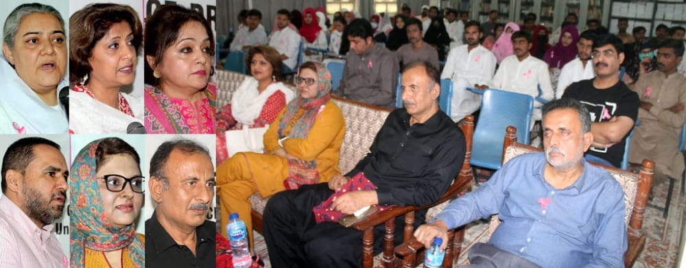 JAMSHORO: Speakers are seen addressing the seminar organized to create awareness about breast cancer.