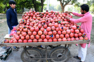 ISLAMABAD: A street vendor is displaying Pomegranate fruit on his pushcart attraction for costumer’s foe selling purpose alongside a road in Federal Capital