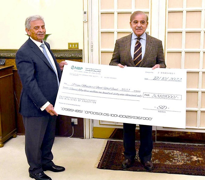 ISLAMABAD: Education Minister Rana Tanveer Hussain presenting to Prime Minister Muhammad Shehbaz Sharif a cheque worth Rs. 53 Million for PM’s Flood Relief Fund.