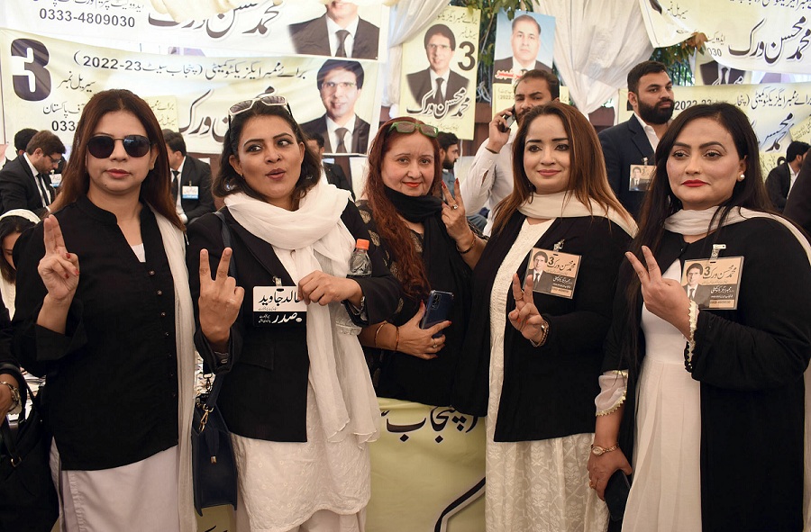 LAHORE: Women lawyers flash victory sign during Supreme Court Barr Association annual election in Provincial Capital.