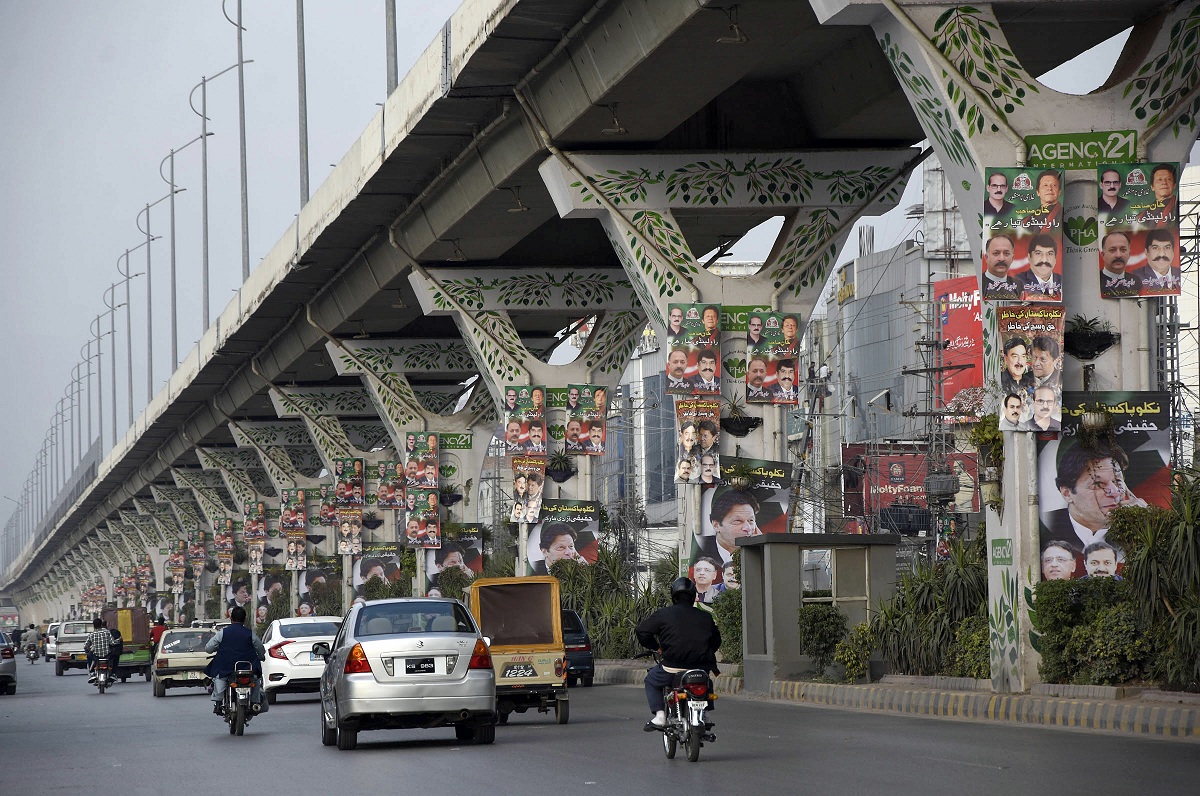 RAWALPINDI: A view of PTI leader Imran Khan portrait banner install on Metro Bus bridge pillars ahead of upcoming long march arrive in the city.