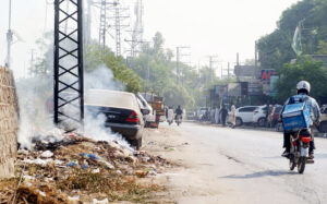 RAWALPINDI-Oct31: A view of smoke rise from a burning pile of garbage alongside Kamran Market at Sadar area in the city that is creating air pollution and harmful for the health of area residents showing negligence of concerned department. ONLINE PHOTO by Raja Asim