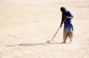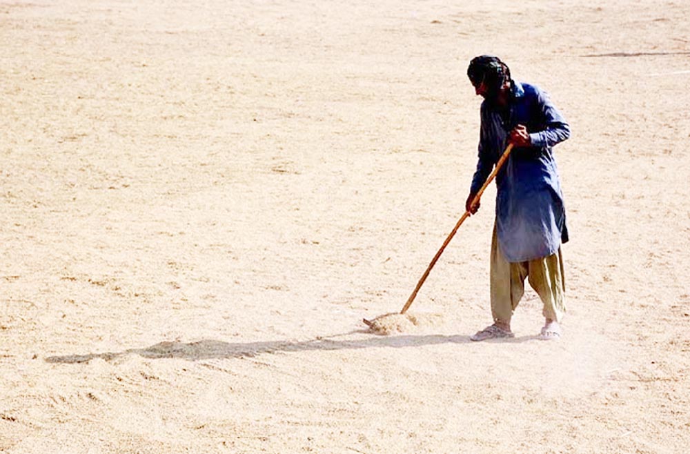 LARKANA: A factory worker spreading the fresh rice for drying in the sunlight at a rice factory before cleaning and packing near Miro Khan Road in the city