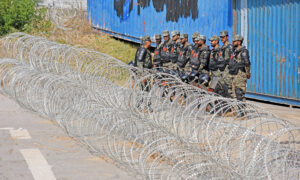 Pic03-003 ISLAMABAD-Nov03: Rangers personals stands alert at D-Chowk due to PTI long march arriving in Federal Capital. ONLINE PHOTO by Sultan Bashir