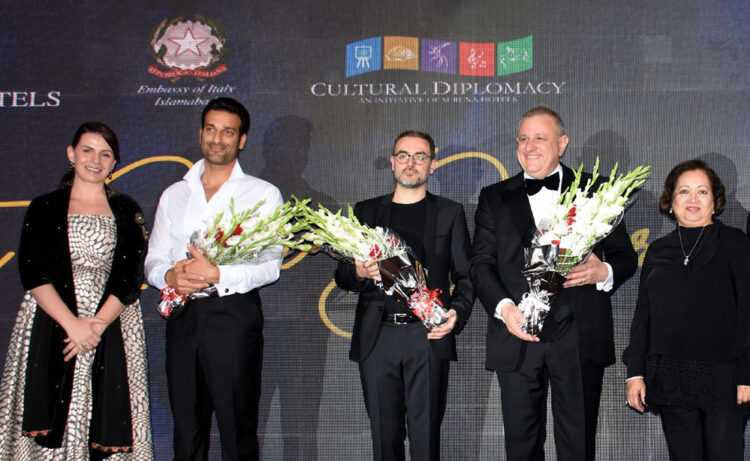 ISLAMABAD-Nov05: Italian Ambassador to Pakistan Andreas Ferrarese posing for a group photograph along with Italian artists Rame Lahaj, and Matteo Pais after the Charity Gala Dinner ceremony for flood effected people in Pakistan organized by Italy Embassy ata local hotel in Federal Capital. ONLINE PHOTO by Sultan Bashir